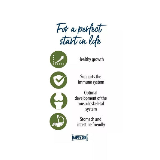 Happy Dog fit & vital Mini Puppy - specialiai subalansuotas visavertis maistas šuniukams nuo pirmojo gyvenimo mėnesio. Pašaras be kviečių. Sausame maiste yra penki, specialiai atrinkti, aukštos kokybės gyvuliniai baltymai – gerai toleruojama ėriena, lengvai virškinama paukštiena, soti jautiena, žuvis ir kiaušiniai, kurie užtikrina subalansuotą augimą ir optimalų vystymąsi. Vertingosios...
