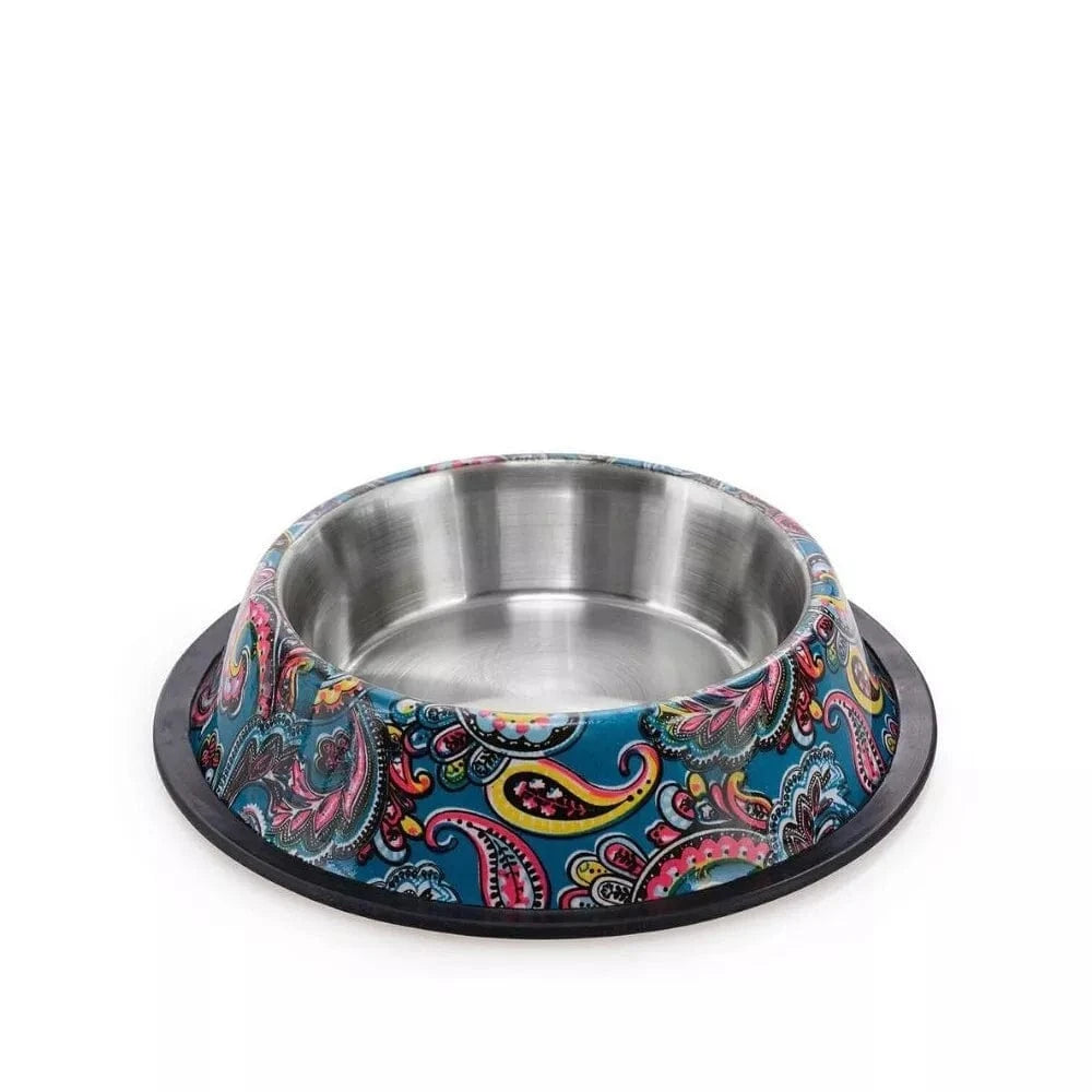 Iš nerūdijančio plieno pagamintas dubuo, padengtas spalvingu raštu. Dėl specialios formos dubenį sunku apversti, be to, jis turi guminį apvadą, kuris neleidžia dubeniui slysti. Tinka tiek vandeniui, tiek maistui. Prekių nuotraukos yra iliustracinio pobūdžio. Prekės aprašymas yra bendro pobūdžio ir ne visos savybės gali būti paminėtos. Ant produkto pakuotės nurodoma informacija yra detalesnė. Rekomenduojame vadovautis informacija esančia ant prekės pakuotės.