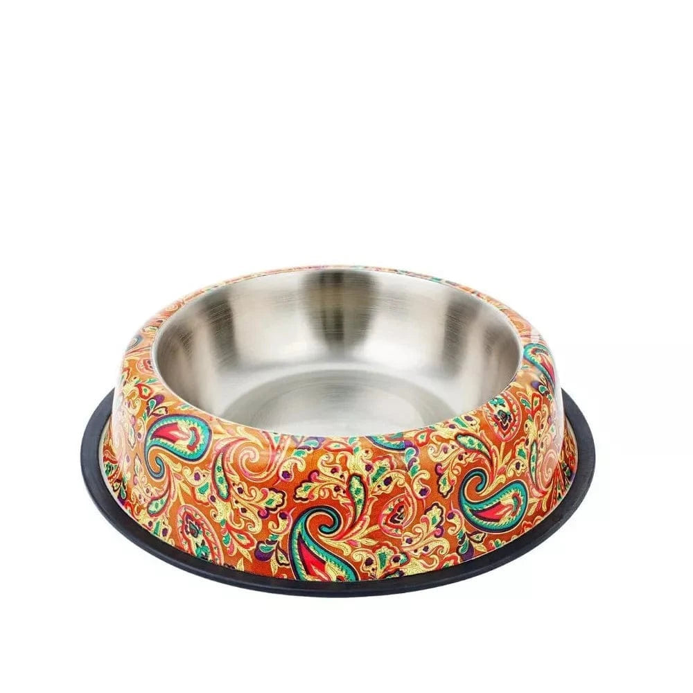 Iš nerūdijančio plieno pagamintas dubuo, padengtas spalvingu raštu. Dėl specialios formos dubenį sunku apversti, be to, jis turi guminį apvadą, kuris neleidžia dubeniui slysti. Tinka tiek vandeniui, tiek maistui.