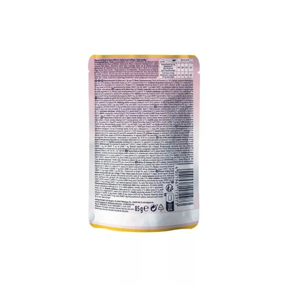„Happy Cat Meat in Sauce Kitten & Junior“ sudėtyje - aukštos kokybės mėsa. Lengvai virškinamas guliašas su paukštiena ir skaniu padažu yra specialiai pritaikytas mažų kačiukų poreikiams. Skaniame pilnaverčiame maiste yra viskas, ko reikia harmoningam kačiuko augimui.