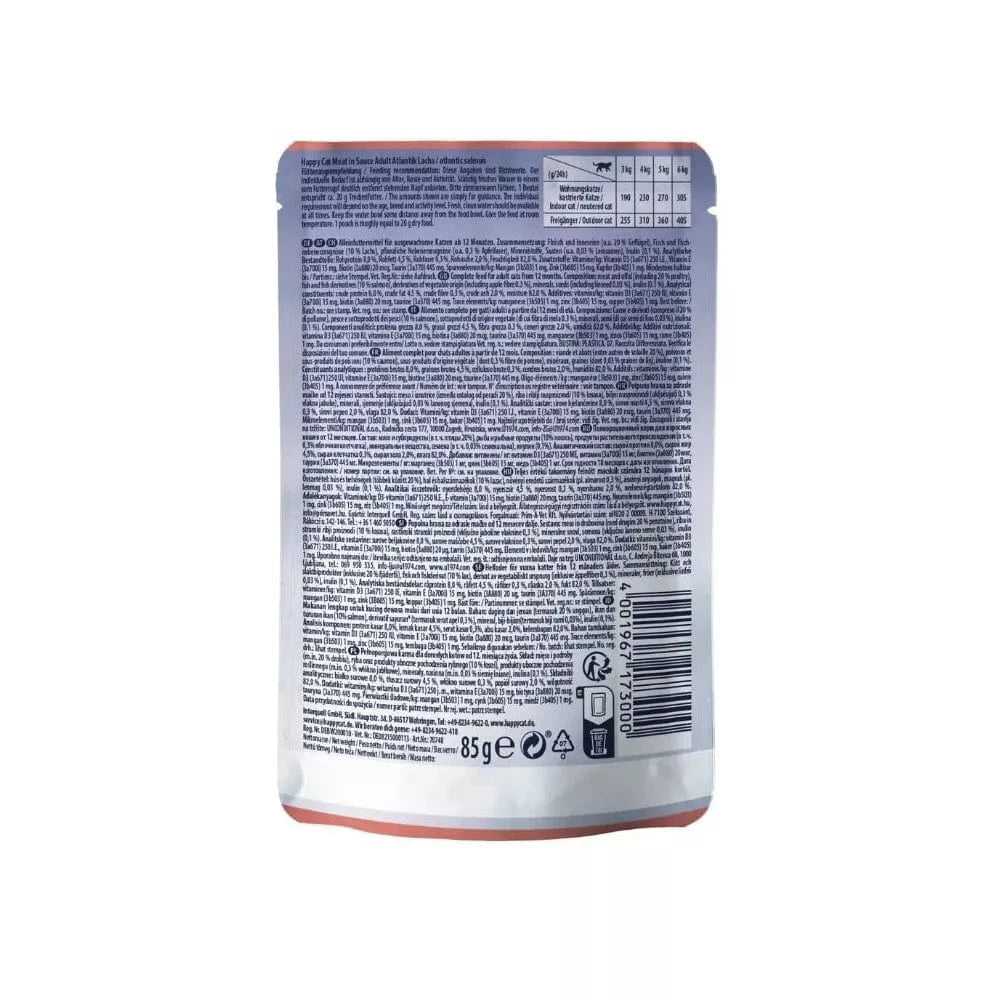 ,,HappyCat Culinary AtlatikLachs" guliašas suaugusioms katėms su lašiša. Sudėtyje yra vertingų omega-3 ir omega-6 riebalų rūgščių, kurios palaiko natūralų kailio blizgesį. Guliašas taip pat tinka sterilizuotoms katėms.