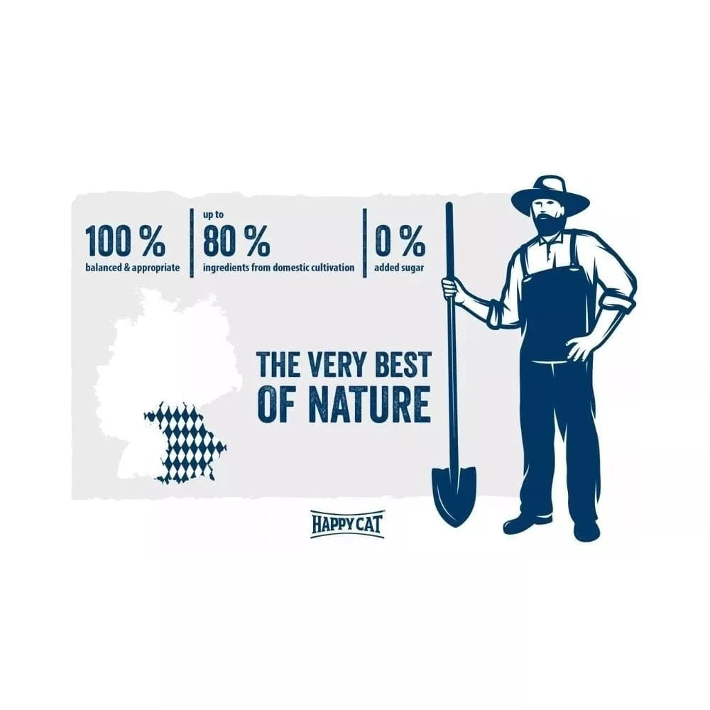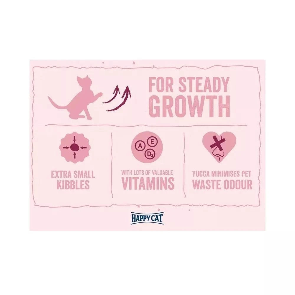 Happy Cat Minkas Kitten Care formulesje ypatingas dėmesys skiriamas augančio organizmo poreikiams. Be aukštos kokybės baltymų, maiste gausu ir nepakeičiamų riebalų rūgščių. Omega-6 riebalų rūgštys (3,0%) prisideda prie odos barjero funkcijos stiprinimo ir kailio blizgesio, o Omega-3 riebalų rūgštys (0,25%) veikia priešuždegimiškai ir yra svarbios smegenų bei akių vystymuisi. Yucca schidigera (0,04%) padeda mažinti nemalonius kvapus išmatose. Taurinas (1000 mg/kg) yra gyvybiškai svarbi amino rūgštis katėms, palaikanti širdies veiklą ir regėjimą. Kompleksas vitaminų A, D3, E bei mikroelementų užtikrina tinkamą medžiagų apykaitą ir bendrą organizmo gyvybingumą.