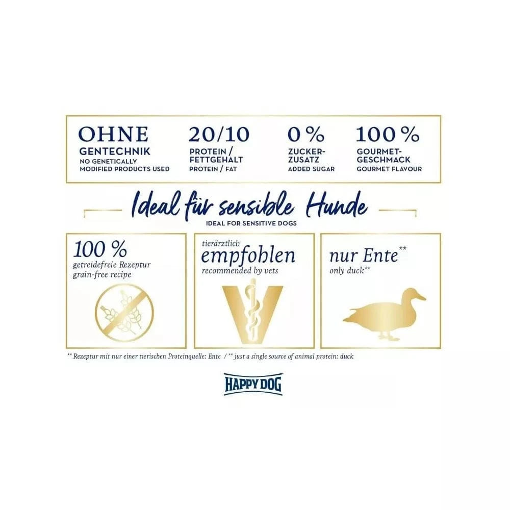 Happy Dog France maistas vidutinių ir didelių veislių šunims su gardžia antiena ir bulvėmis. Receptas subalansuotas taip, kad Jūsų augintinį aprūpintų visomis būtinomis maisto medžiagomis, vitaminais ir mineralais. Sudėtis papildyta nepakeičiamomis  omega 3 ir omega 6 riebalų rūgštimis, kurios palaiko gražų ir žvilgantį kailį, gerą imuninę sistemą.