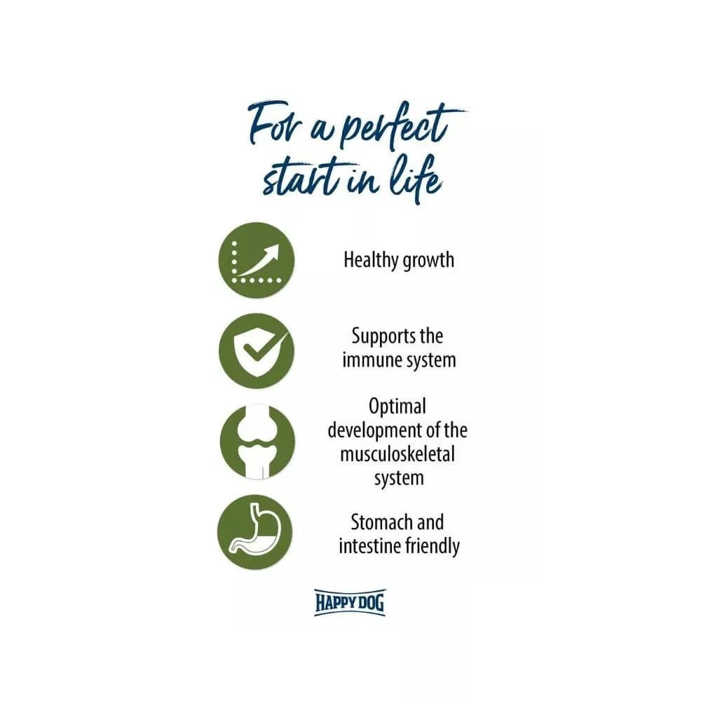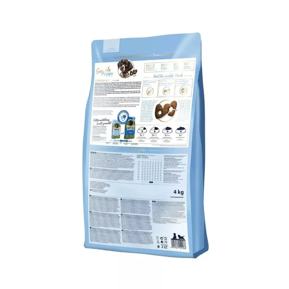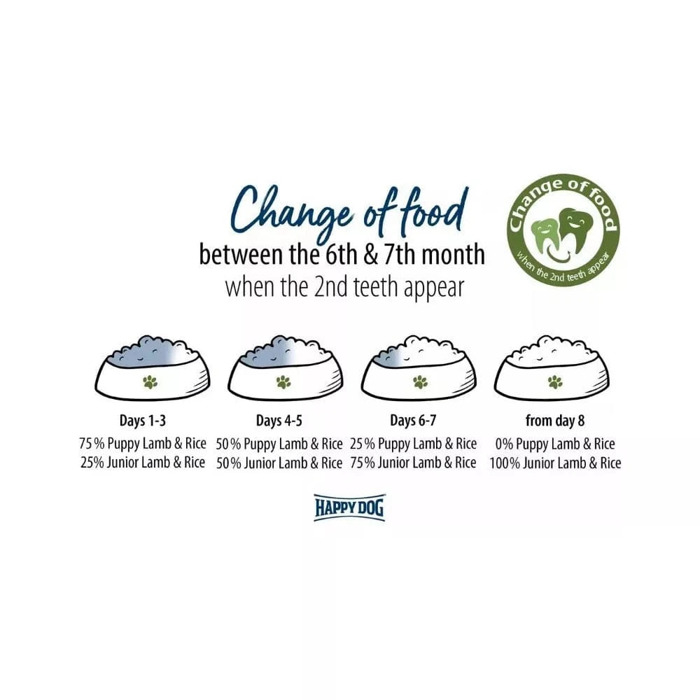 Kiek laiko reikia duoti Sensible Puppy Lamb & Rice? Happy Dog Sensible Puppy Lamb & Rice idealiai tinka šuniukams nuo 4 savaičių iki 6 mėnesių. Kai jam sukaks 7 mėnesiai, turėtumėte palaipsniui pereiti prie Happy Dog Sensible Junior Lamb & Rice. Taip yra todėl, kad nuo 7 mėnesio augimas sulėtėja, keičiasi mitybos poreikiai.