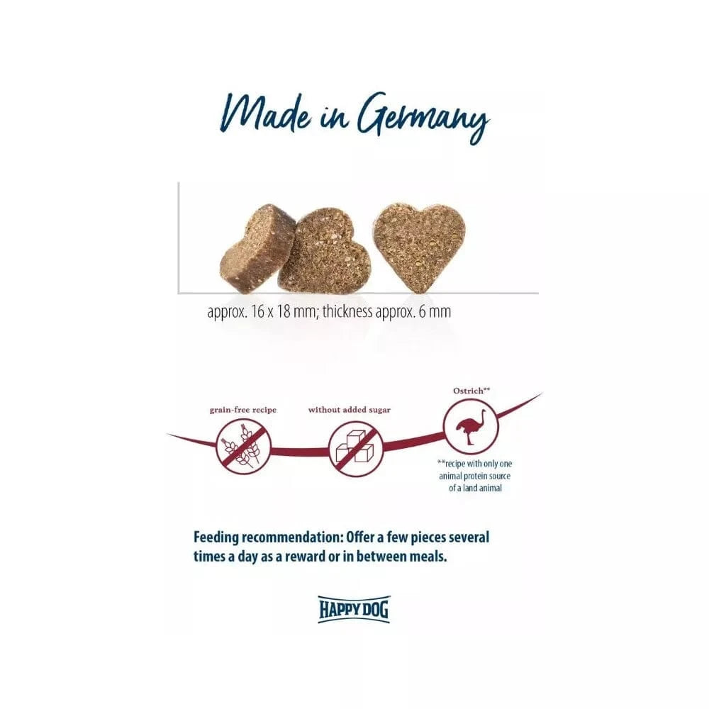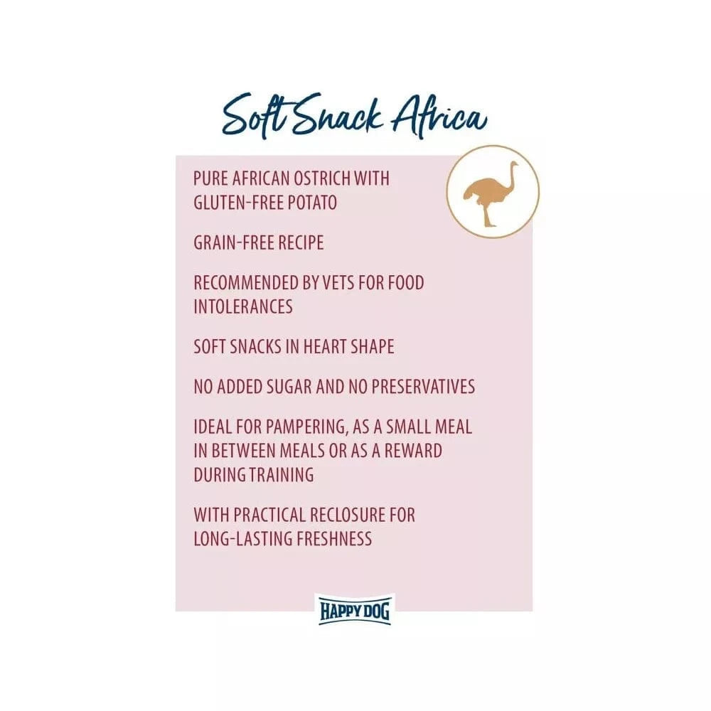 Minkšti širdelių formos skanėstai "Africa Snacks" puikiai tinka jūsų augintiniui palepinti. Šių užkandžių sudėtyje - neįprastas vienintelio baltymo šaltinis - stručio mėsa - su bulvėmis be glitimo. Šis receptas be grūdų puikiai pritaikytas jautriems šunims ir šunims, kuriems sunku įtikti, be to, jis rekomenduojamas, kai netoleruojamas maistas. Šiuose skanėstuose nėra pridėtinio cukraus ir konservantų. Maišelius galima pakartotinai uždaryti, todėl užkandžiai ilgiau išlieka švieži.Nepakartojamas malonumas!