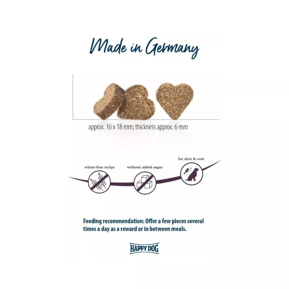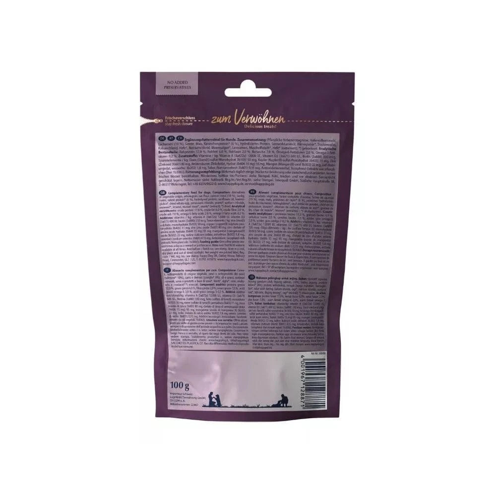 Pašaro papildas suaugusiems šunims. Minkštas užkandis su geriausios kokybės lašiša ir triušiena odai ir kailiui. Ieškote tinkamų skanėstų šuniui? Išbandykite širdelės formos minkštus skanėstus "Soft Snack Ireland" - tai puikus skanėstas jūsų augintiniui. Švelni lašiša ir skanus triušis yra gardūs, o Omega-3 ir Omega-6 riebalų rūgštys padeda palaikyti blizgantį kailį. Receptą be kviečių gerai toleruoja jautrūs ir išrankūs vidutinių ir didelių veislių šunys. Šie užkandžiai pagaminti be pridėtinio cukraus ir be konservantų. Maišelis patogiai uždaromas, kad ilgiau išliktų šviežias. Garantuotas malonumas! Sudėtis: augaliniai produktai, pilno grūdo avižų miltai, lašišų miltai (10%), miežiai, kukurūzai, triušienos baltymai (6%), hidrolizuoti baltymai, saulėgrąžų aliejus, hemoglobinas, kiaušinių milteliai, kalio chloridas, mielės, natrio chloridas, jūrų dumbliai, linų sėmenys, moliuskų mėsa, mielės (ekstraktas). Analitinės sudedamosios dalys: žali baltymai 17,0%, žali riebalai 6,0%, žalia ląsteliena 2,0%, žali pelenai 7,0%, drėgnis 14,0%, omega 6 riebalų rūgštys 2,0%, omega 3 riebalų rūgštys 0,2%. Priedai/1 kg: vitaminai: vitaminas A (3a672a) 12000 TV, vitaminas D3 (3a671) 600 TV, biotinas (3a880) 330 mcg. Mikroelementai: geležis (geležies II sulfatas, monohidratas 3b103) 50 mg, varis (vario II sulfatas pentahidratas 3b405) 11 mg, cinkas (cinko oksidas 3b603 80 mg, cinko chelatas iš amino rūgščių 3b606 15 mg) 95 mg, manganas (manganao II oksidas 3b502) 22 mg, jodas (kalcio jodatas, bevandenis 3b202) 1,8 mg, selenas (natrio selenitas 3b801) 0,15 mg. Antioksidantai, tokoferolio ekstraktas iš augalinių aliejų 1b306(i). Šėrimo rekomendacijos: duoti po keletą gabalėlių per dieną kai skanėstą kasdienio raciono paįvairinimui. Augintinis visuomet turi turėti šviežio vandens. Laikyti vėsioje, sausoje vietoje, saugoti nuo tiesioginių saulės spindulių. Geriausias iki/Partijos numeris/Gamintojas: žr. ant pakuotės. Prekių nuotraukos yra iliustracinio pobūdžio. Prekės aprašymas yra bendro pobūdžio ir ne visos savybės gali būti paminėtos. Ant produkto pakuotės nurodoma informacija yra detalesnė. Rekomenduojame vadovautis informacija esančia ant prekės pakuotės.