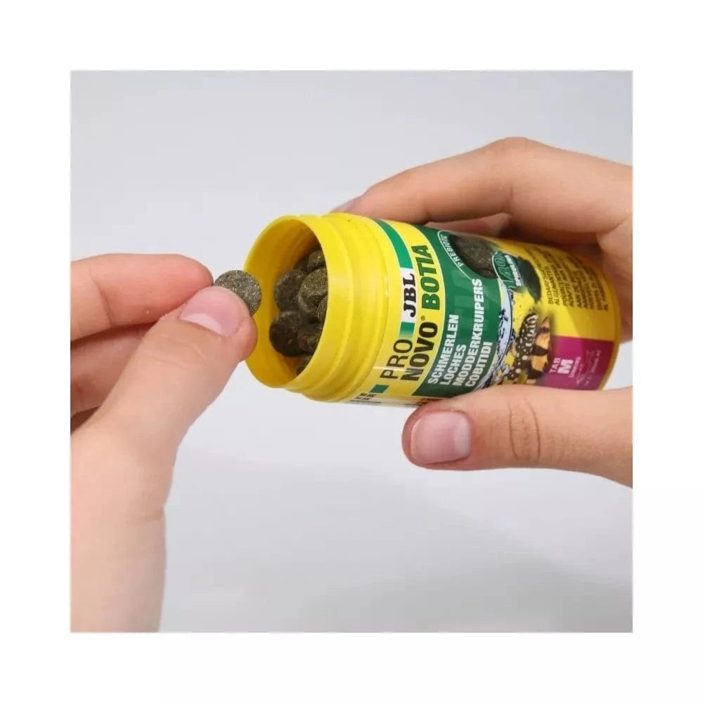 JBL ProNovo Botia Tab M maistas yra universalus ir tinka ne tik botijoms, bet ir visoms kitoms dugninėms žuvims, kurios mėgsta maisto ieškoti akvariumo dugne arba maitintis nuo paviršių. Jo ypatinga formulė užtikrina, kad tabletės lėtai tirps vandenyje, suteikdamos žuvims pakankamai laiko jį suėsti, taip mažinant maisto likučių poveikį vandens kokybei. Natūralios žaliavos, tokios kaip spirulina, lašišų miltai ir krevečių miltai, suteikia reikalingų baltymų, vitaminų ir mineralų, kurie yra gyvybiškai svarbūs akvariumo faunai.