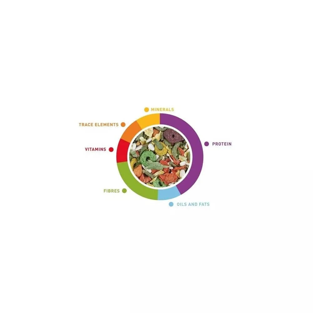 Mūsų Premium Coniglietti pašaras yra kruopščiai suformuluotas, kad atitiktų suaugusių triušių mitybinius poreikius. Sudėtyje yra įvairių grūdų, vertingų augalinių produktų, tokių kaip 6% liucernos, ir sultingų vaisių, pavyzdžiui, 4% vynuogių. Tai ne tik suteikia pašarui patrauklų skonį, bet ir praturtina jį maistinėmis medžiagomis. Didelis kiekis sėklų (12% saulėgrąžų) ir daržovių, įskaitant 6.5% žirnių, 5% morkų ir 0.5% ropių, užtikrina įvairiapusę mitybą. Pašaras papildytas augalinių baltymų ekstraktais, mineralais, aliejais ir riebalais, siekiant užtikrinti optimalią augintinio sveikatos būklę ir energijos lygį.