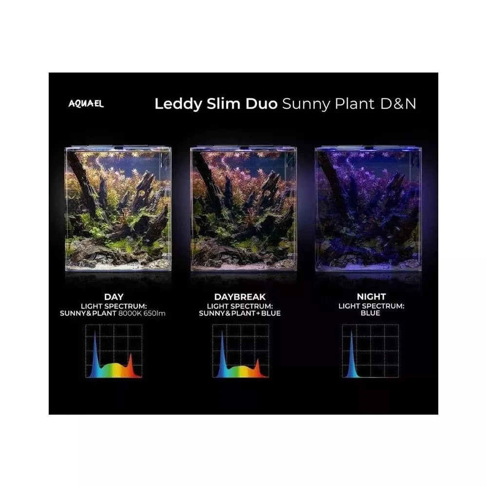 Vienas svarbiausių akvariumo elementų – tinkamas apšvietimas. „Leddy Slim Duo Sunny & Plant D&N“ apšvietimo sistema yra tikras atradimas. Ji puikiai atkuria akvariumo vidaus spalvas, suteikdama gyvūnams ir augalams natūralią aplinką. Unikalus „Sunny“ spektras padeda gyvūnams atskirti dienos ir nakties ciklus, o „Plant“ spektras skatina spartų ir sveiką augalų augimą. Su trimis apšvietimo režimais – DAY (dienos), DAYBREAK (aušros) ir NIGHT (nakties) – galite sukurti įvairias nuotaikas ir visapusiškai patenkinti savo akvariumo gyventojų poreikius visą parą.