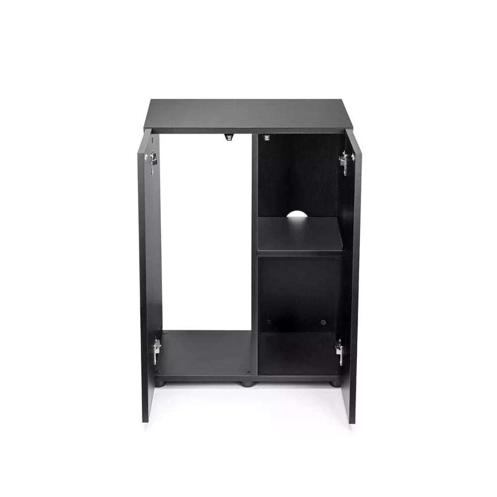 Šios spintelės aukštis (80 cm) yra idealus – jis leidžia patogiai stebėti povandeninį pasaulį net sėdint ant sofos, o atliekant priežiūros darbus nereikia itin žemai lenktis. Viduje spintelė padalinta į dvi dalis, viena kurių neturi galinės sienelės – tai puiki vieta paslėpti išorinius filtrus ar CO2 sistemas bei patogiai nutiesti laidus ir žarnas. Antrame skyriuje esančią lentynėlę galima reguliuoti net trijose skirtingose aukštyje, pritaikant erdvę pagal Jūsų poreikius ir laikomus įrenginius.