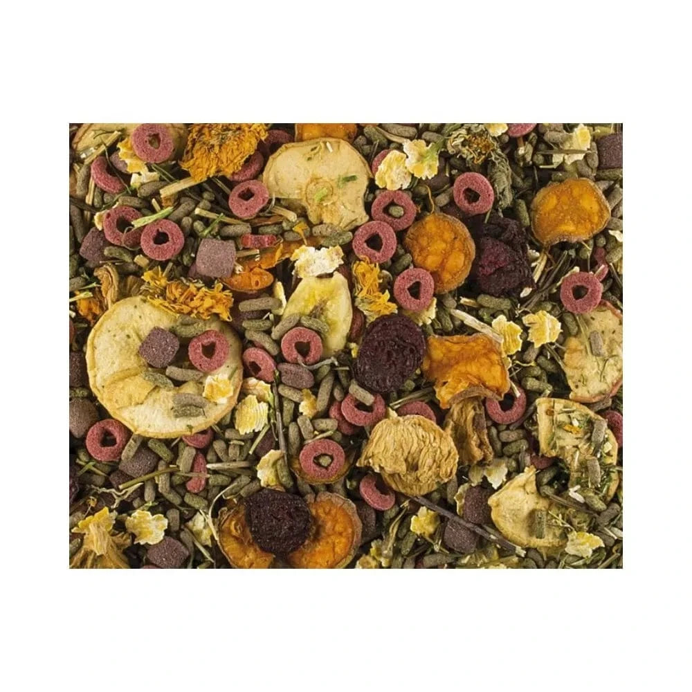 Visavertis maistas jūrų kiaulytėms, kurio pagrindą sudaro liucernos granulės, žolės, obuoliai ir džiovintos daržovės bei prieskoninės žolelės. Gausu lengvai įsisavinamų vitaminų.Linų sėmenys, kuriose gausu nepakeičiamų riebalų rūgščių, užtikrina gerą odos ir kailio būklę.Sudėtis praturtinta vitaminu C.Daugelyje ingredientų esantys prebiotikai skatina gerųjų žarnyno bakterijų veiklą ir taip stiprina imunitetą.Sudėtyje esantis zeolitas mažina nemalonų išmatų kvapą.Be GMO, konservantų, kvapiklių, pridėtinio cukraus ir aromatų.Šėrimo rekomendacijos: augintinis visuomet turi turėti pašaro ir šviežio vandens.Sudėtis: grūdai (įskaitant kukurūzus), vaisiai (džiovinti obuoliai granulėmis 15%, džiovinti obuoliai 2%, džiovinti ananasai. džiovinti bananai), augaliniai produktai (alfalfa granulės 5%, mėtos, ramunėlės, petražolės, medetkų žiedai), daržovės (džiovinti burokėliai 2%, džiovintos morkos 2%), sėklos (linų sėmenys granulėmis 1,5%), mineralai (zeolitas 1%).Priedai: vitaminai: vitaminas C 250 mg/kg.Analitinės sudedamosios dalys: žali baltymai 12,0%, žali aliejai ir riebalai 4,0%, žalia ląsteliena 14,0%, drėgnis 11,0%.Laikyti sausoje vietoje.Geriausias iki/Partijos Nr./Grynasis kiekis/Gamintojas: žr. ant pakuotės.Prekių nuotraukos yra iliustracinio pobūdžio. Prekės aprašymas yra bendro pobūdžio ir ne visos savybės gali būti paminėtos.  Ant produkto pakuotės nurodoma informacija yra detalesnė. Rekomenduojame vadovautis informacija esančia ant prekės pakuotės.