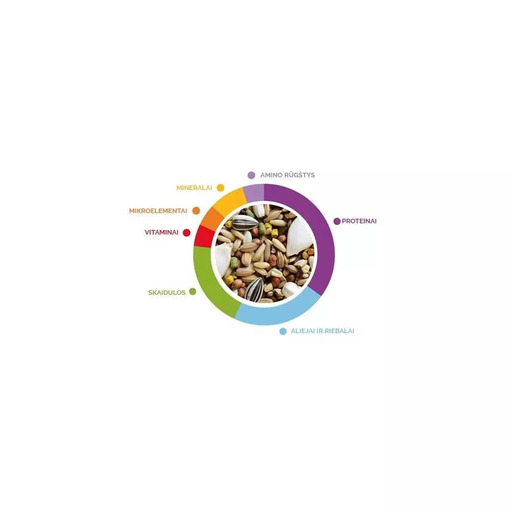 Kiekviena lesalo porcija yra tikras vitaminų ir mineralų lobynas. Vitaminai A, D3, E padeda palaikyti regėjimą, kaulų sveikatą ir stiprina organizmo apsaugines funkcijas. Geležis, jodas, varis, cinkas ir selenas atlieka svarbias funkcijas organizme, skatindami tinkamą medžiagų apykaitą ir bendrą gyvybingumą. Pridėta DL-metionino ir L-lizino amino rūgščių palaiko baltymų sintezę ir skatina sveiką plunksnų augimą, užtikrinant jūsų paukščio nepriekaištingą išvaizdą.